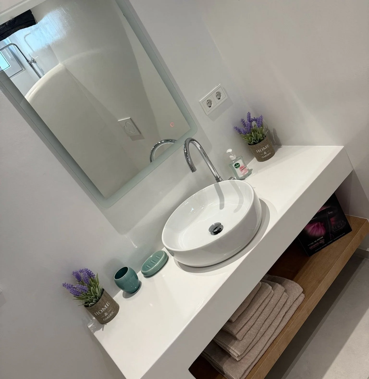 Das gesamte Badezimmer ist im Mykonos-Style Patiiti gestaltet, welches einfach abwaschbar und somit besonders hygienisch ist.